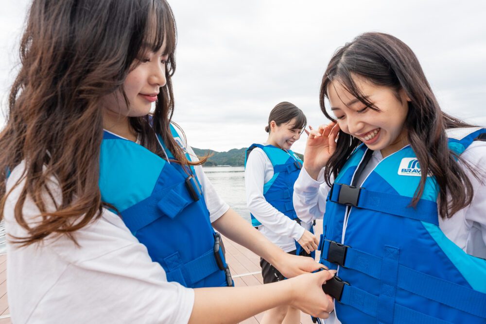 사전에 스탭으로부터 주의점과 추천 포인트의 강의를 받으면서, 라이프 재킷과 마린 슈즈를 장착하고 막상 도전!