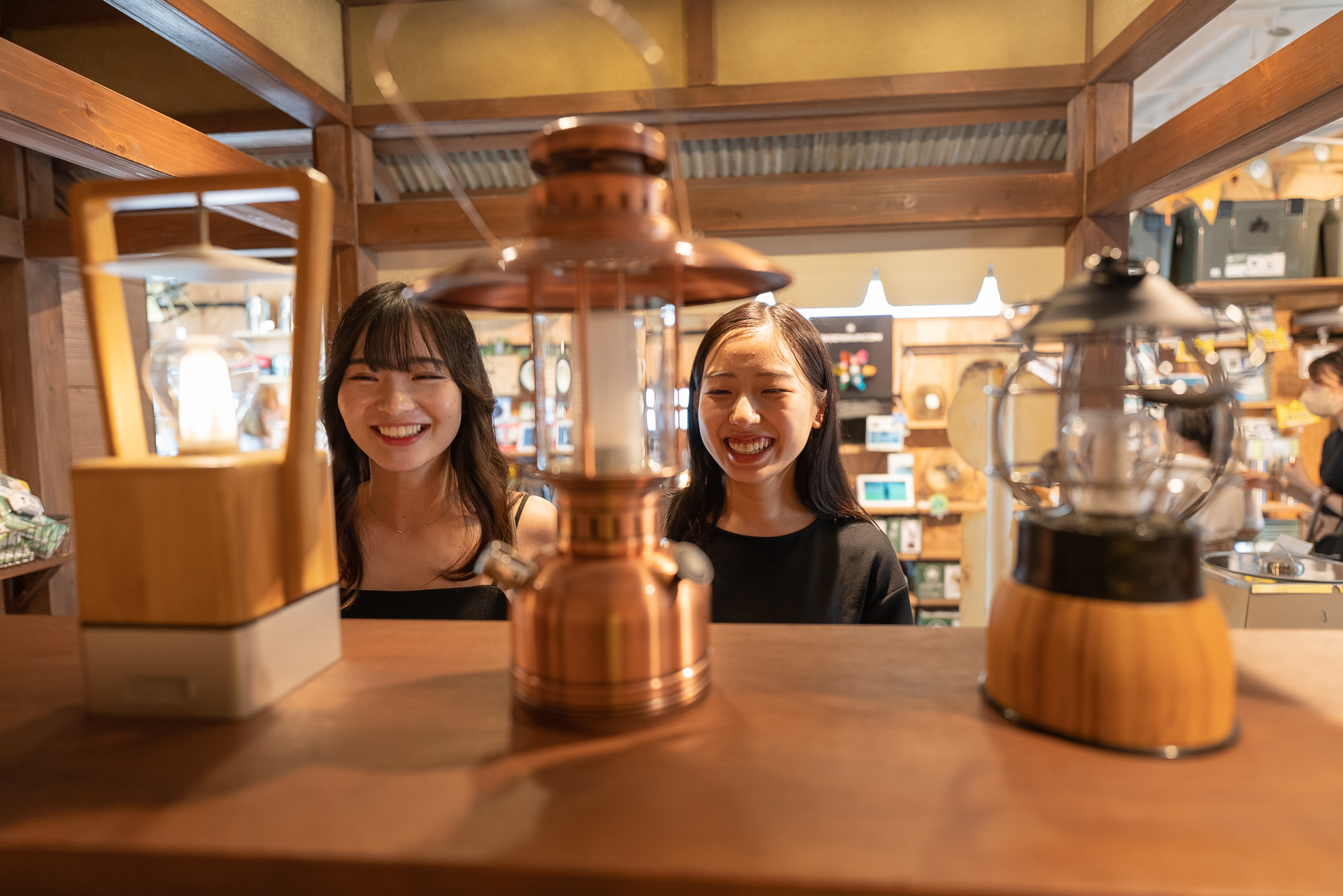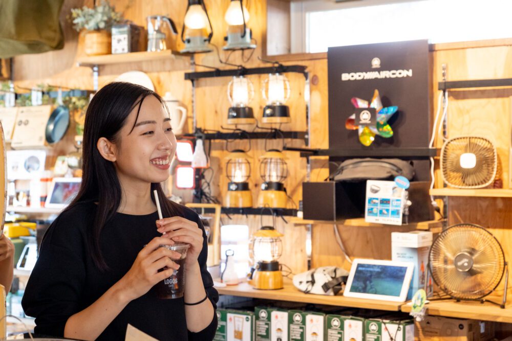 숍 내에는 아웃도어 아이템뿐만 아니라 교토의 로고스랜드에서도 인기의 과자 가게 「엔조이 본포」도 병설