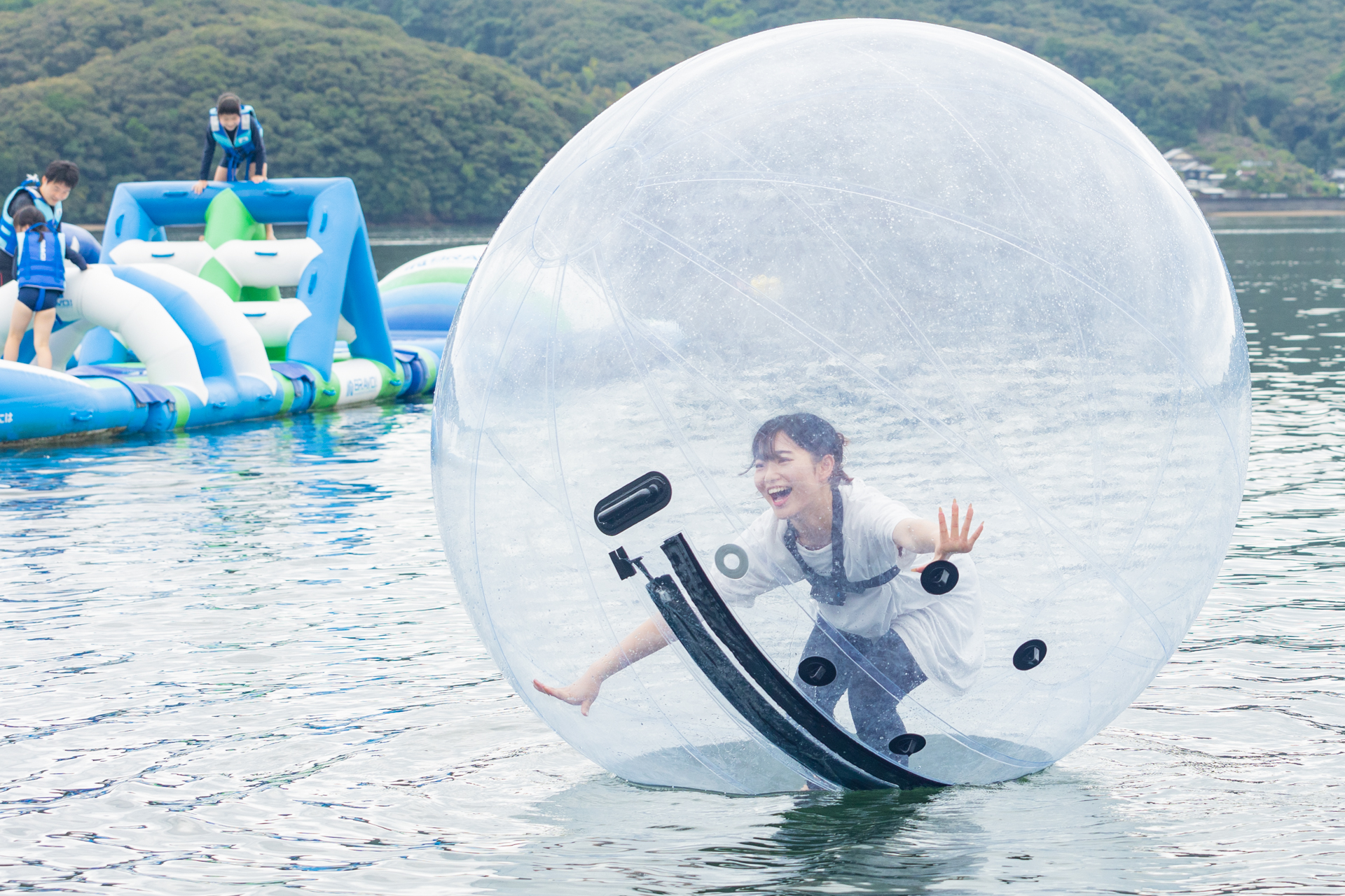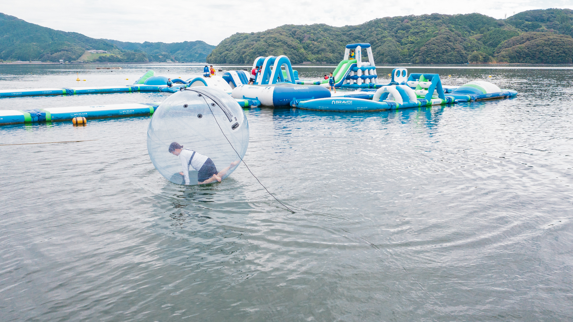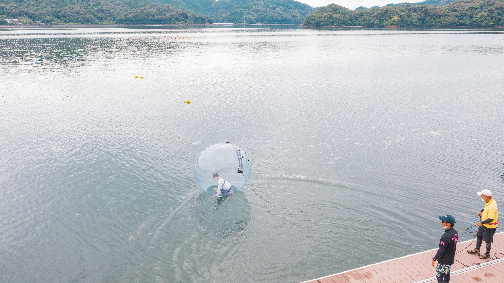 투명한 구체로 주위의 경치를 즐기면서 우아하게 바다 위를 산책… 이게 상상 이상으로 어렵다! 걷기는커녕 서는 것조차 여의치 않고, 하물며 달린다니 허들 너무 높다!! 그러나 요령을 잡으면 잘 서거나 걸을 수 있으며, 평소의 생활에서는 맛볼 수 없는 신기한 감각을 체험할 수 있습니다.♪