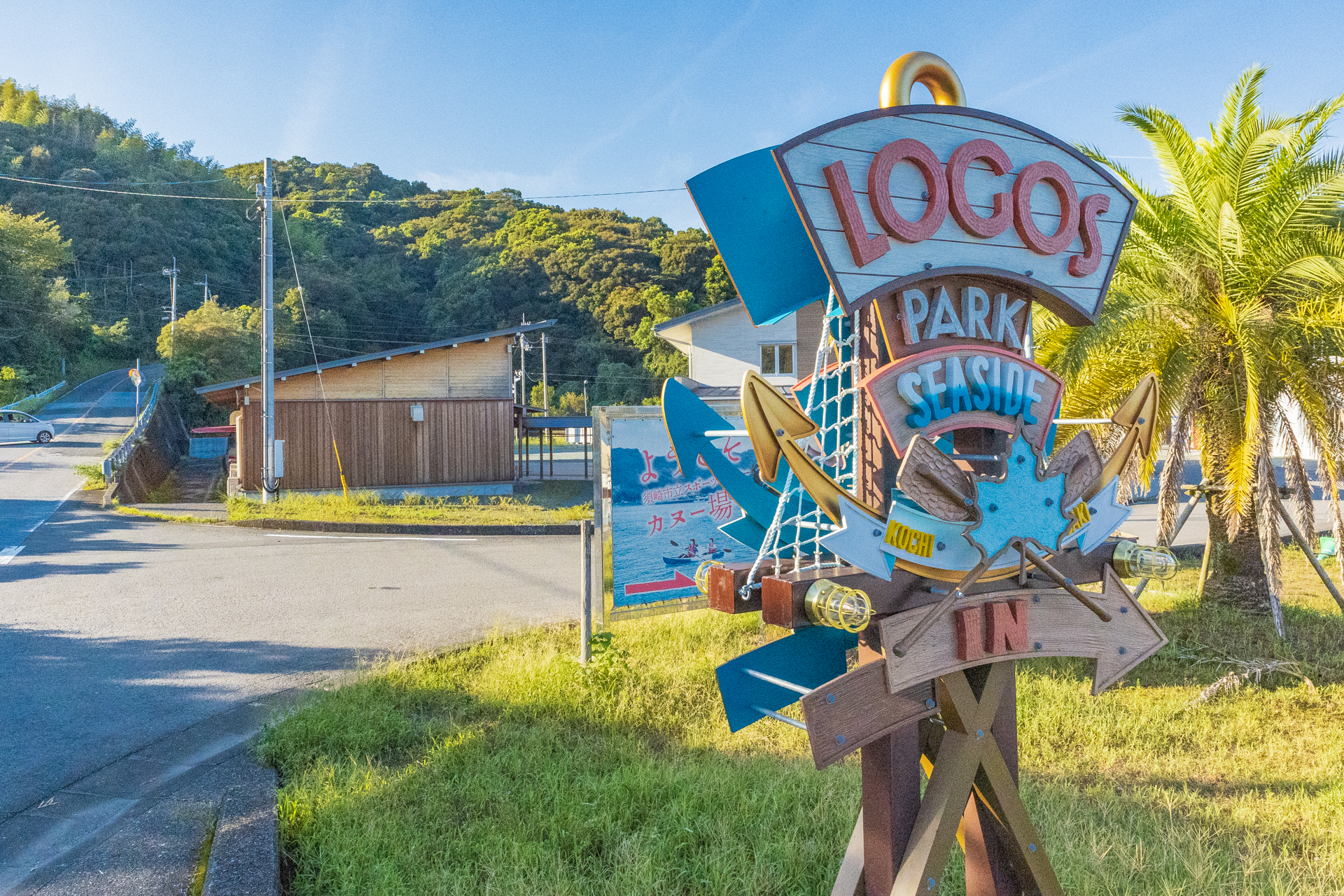 고치역에서 차로 약 45분, 산길을 빠져나간 먼저 나타나는 것이 배를 이미지한 큰 "LOGOS PARK SEASIDE"의 간판.