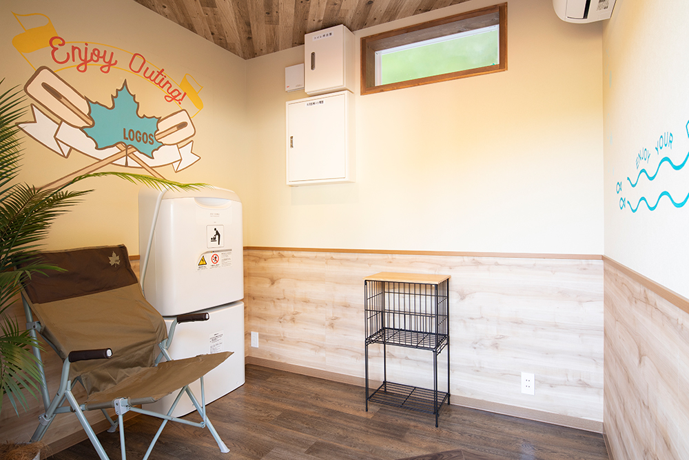 또 각 동 각각 다른 인테리어가 베풀어진 컨테이너 하우스는 전동 냉난방 완비체어나 침낭 등 실제로 로고스 브랜드의 아이템을 시험할 수 있는 것도 기쁘다.하우스 내에는 샤워나 냉장고 등도 붙어있어 "벌레가 무서워 텐트에서 잠을 잘 수 없다.…라고 하는 분이나 편안한 아웃도어를 즐기고 싶다!라고 하는 분에게 추천합니다.